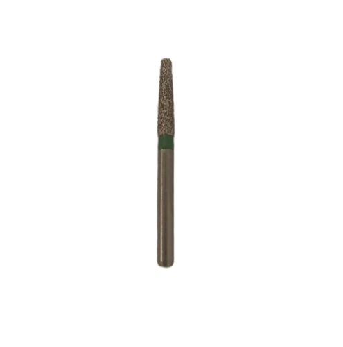 Рабочая часть с конусной формой толщиной 1,8 мм и грубой зернистостью алмазной крошки позволяет эффективно удалять материал, сохраняя точность. Хвостовик прочно фиксируется в ротационном наконечнике, вращаясь с частотой до 450 тыс. об/мин без вибрации.